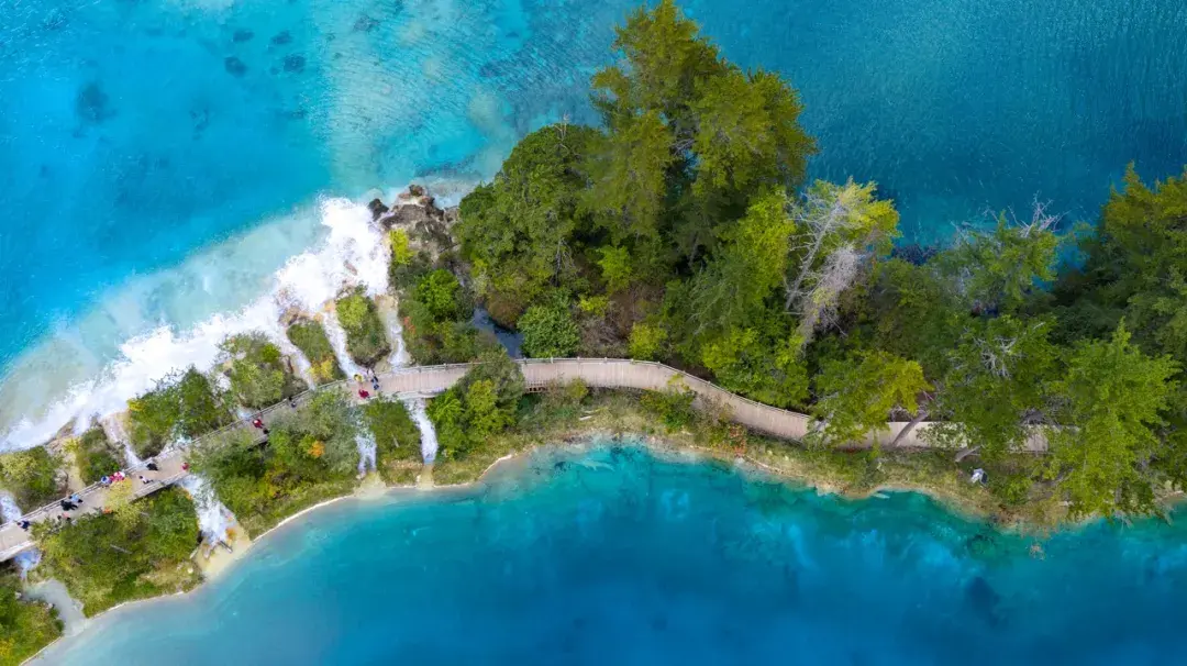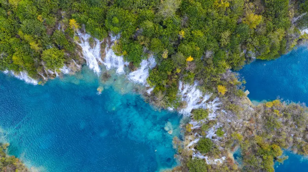 海子之间由低矮的堤坝相隔,水流漫过堤坝,形成了一道道小巧玲珑的瀑布,被称为“树正瀑布群”,在阳光的照射下折射出晶莹的光芒。
