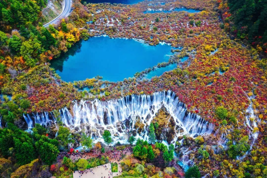秋季是九寨沟最美的季节,每年10月中下旬,漫山遍野的树叶变得五彩斑斓,红的、黄的、橙的、绿的,与湛蓝的海子、洁白的雪峰构成了一幅绚丽多彩的油画;