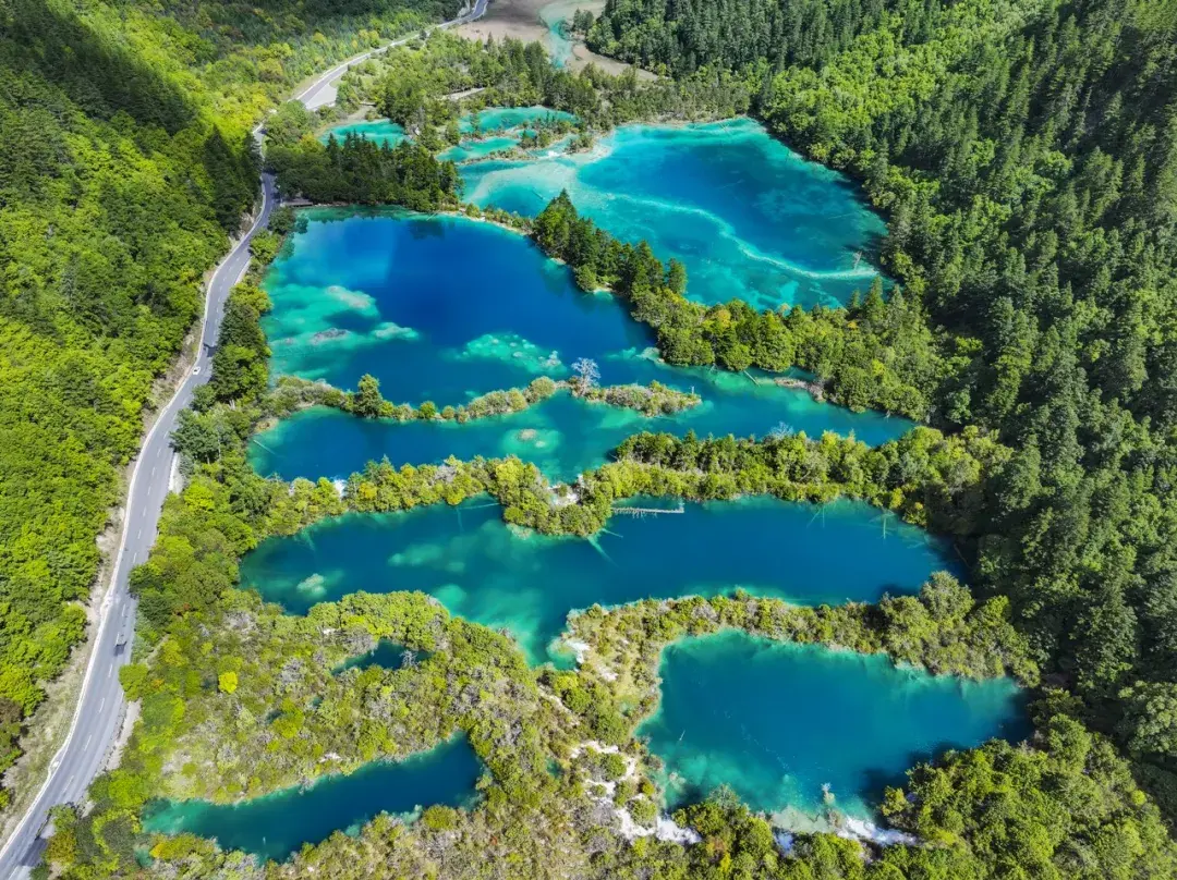 沟内的树正群海由十八个大小不一的海子组成,它们如同串在一起的翡翠,沿着山谷依次排开。